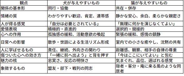 では、**「犬と猫は、人の心に何を与えるか」**を、軍師流に整理してお示しいたします。