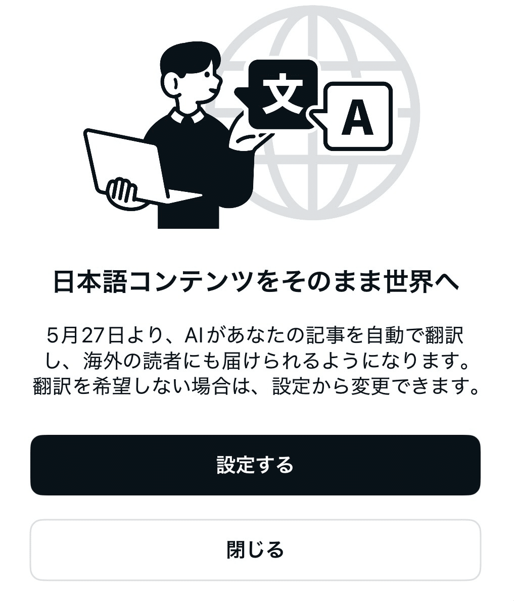 ①現在、noteに日本語で投稿されている記事を、 2026年5月27日から、 AIが英語に自動翻訳する