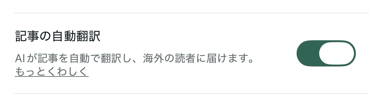 ③あらかじめ、「記事の自動翻訳」の設定は全員ONの状態になっている。自分のnoteを①②の対象から外したい場合は、5月27日よりも前に、noteのユーザー自らがOFFの状態に設定する必要がある