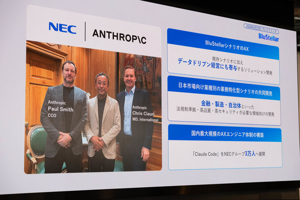 日本電気(以下、NEC)は米Anthropicとの協業を開始し、コーディングエージェント「Claude Code」をNECグループの従業員3万人に展開する。開発効率を高めることで、Anthropicとの協業で目指す、日本企業向けソリューションの共同開発や、NECのソリューション群「BluStellar」への「Claude」の組み込みを促進させる。「Claude Mythos Preview」(以下、Mythos)の利用可否については回答を控えたが、「Anthropicの新しいテクノロジーを今後使うことは協業のスコープに入っている」とした。