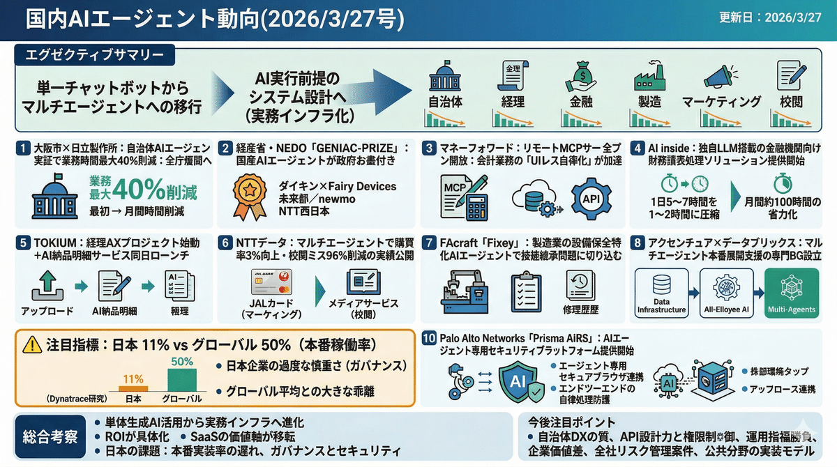 2026/3/26の国内AIエージェント動向は、自治体、経理、金融、製造、マーケティング、校閲など、現場の基幹業務でAIが「補助」から「自律実行」へ移行し始めたことが見える。大阪市やNTTデータ、AI inside、TOKIUMなどは、業務時間削減や購買率向上といった定量成果を提示し、導入効果の見える化が進んだ。一方で、日本企業の本番稼働率は11%と低く、PoC止まりの構造も依然残る。今後はMCP対応によるUIレス化、マルチエージェント化、専用セキュリティ整備を伴いながら、全社展開と業務再設計が競争力の分岐点になる。