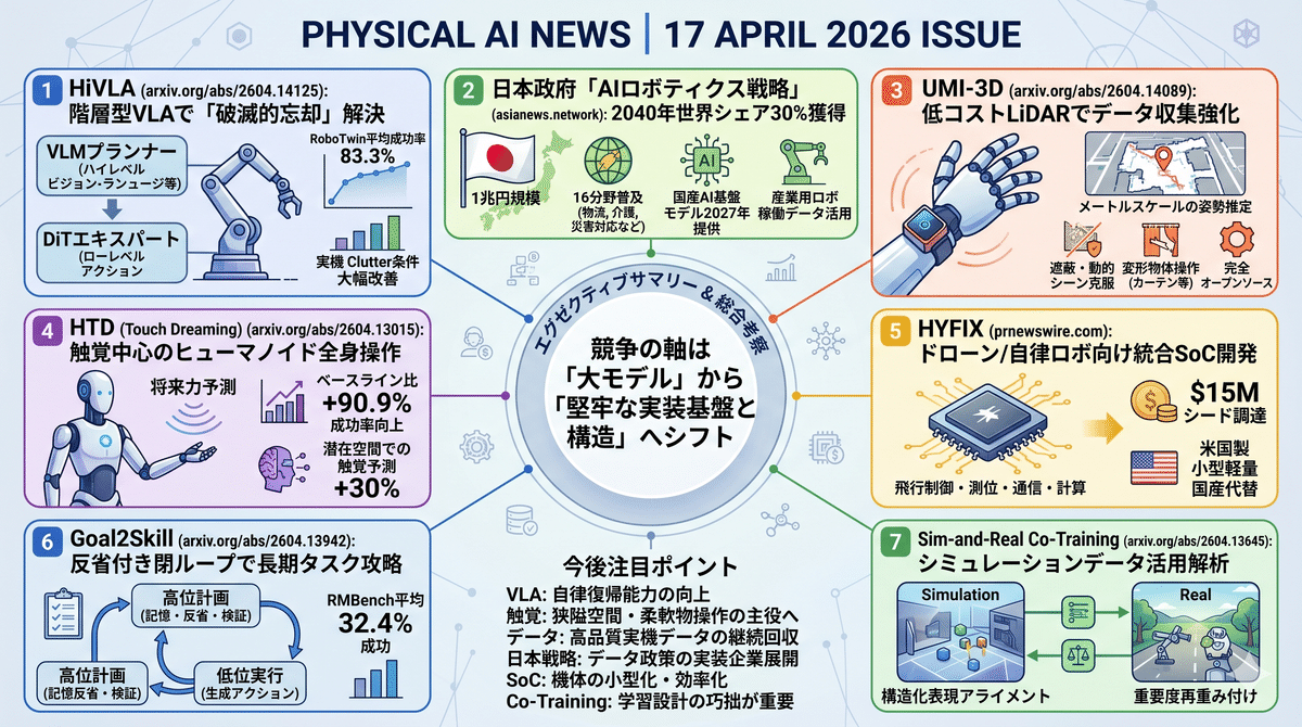 2026/4/16のフィジカルAIは、研究・産業・政策が前進したことを示した。HiVLAはVLMプランナーとDiTエキスパートを分離する階層設計で破滅的忘却を抑え、RoboTwin平均83.3%を達成。Goal2Skillは記憶付き反省ループで長期操作の復旧力を高めた。HTDは触覚を第一級モダリティとして全身操作を改善し、UMI3Dは低コストLiDARで実機データ収集の質を底上げ。さらにSimandRealCoTrainingがシミュレーション併用学習の原理を整理し、日本政府のAIロボティクス戦略とHYFIXの統合SoC開発は、競争軸がアルゴリズムだけでなく国家支援、人材、半導体、供給網へ広がっていることを示している。