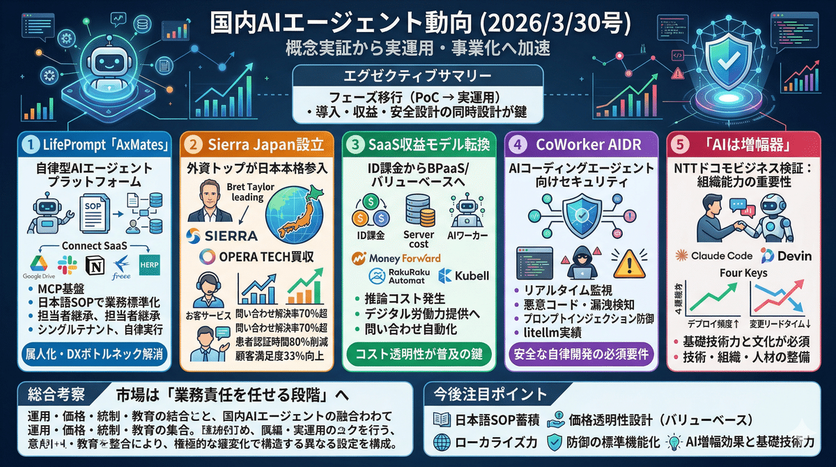 2026/3/29の国内AIエージェント市場は、概念実証から実運用・事業化へとフェーズが進み始めていることが見える。LifePromptのAxMatesは、MCP連携と日本語SOPによって、属人化しやすい業務を現場主導で標準化し、自律実行までつなげる設計が特徴だ。SierraのOPERA TECH買収は、海外トッププレイヤーが日本市場を重要戦場と見始めた証左であり、競争環境を一段引き上げる。国内SaaS各社も推論コストを背景に、ID課金からバリューベース課金やBPaaS化へ舵を切りつつある。同時に、CoWorker AIDRやNTTドコモビジネスの検証が示すように、精度だけでなく、セキュリティ、料金透明性、運用人材、評価指標まで含めて整備できる企業が優位に立つ局面に入った。今回の論点は、新製品紹介ではなく、導入設計・収益設計・安全運用設計が同時に問われる新段階の到来を示している。