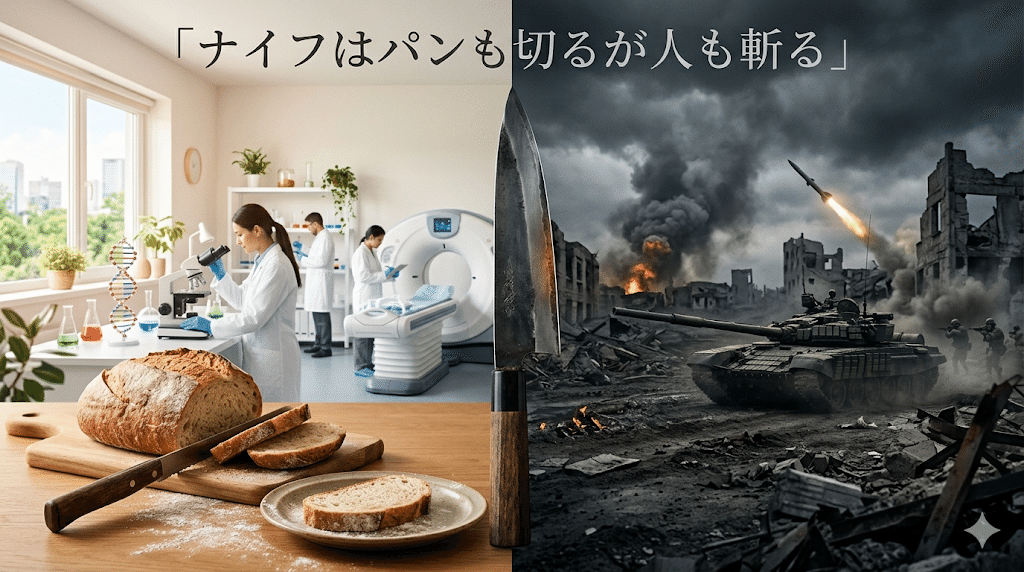「ナイフはパンも切るが人も斬る」ということわざがあります 。科学が作ったナイフという道具は、パンを切る時には重宝しますが、人を斬ることもできます 。科学自体は善いものでも悪いものでもなく、それによって寿命が延びたり便利になったりする一方で、戦争を悲惨なものにもしました 。科学は兵器に使われやすいのです 。