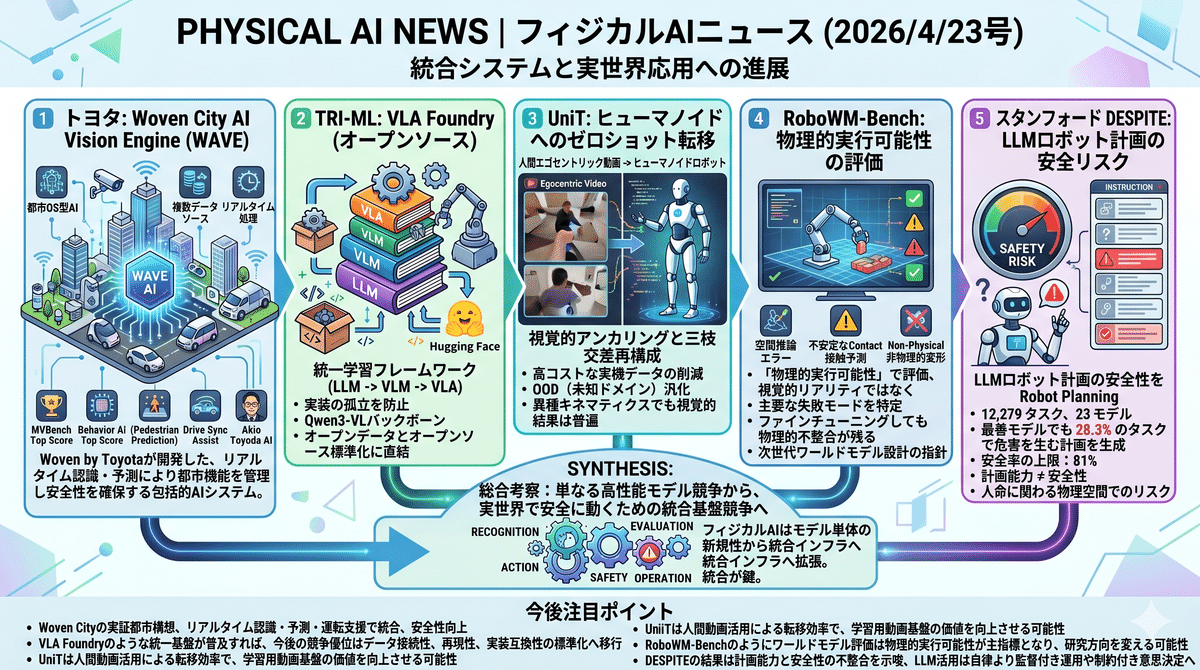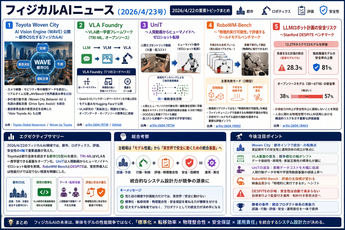 2026/4/22のフィジカルAI領域では、都市、ロボティクス、評価、安全性の4軸で重要進展が見えた。ToyotaはWoven City向け大規模AI基盤WAVEを公開し、都市全体をリアルタイム認識・予測・運転支援で統合する都市OS型AIを提示。TRI-MLはLLMからVLAまでを一貫学習できるVLA Foundryをオープン化し、研究標準化を前進させた。さらに、人間動画からヒューマノイドへゼロショット転移するUniT、物理的実行可能性を問うRoboWM-Bench、LLMロボット計画の危険性を示すDESPITEが、実世界導入に向けた性能だけでは足りないという現実を明確にした。