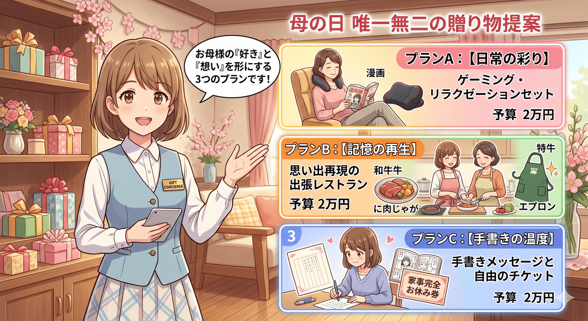 # ステップ2:3つのコンセプト提案 私の回答を受け、以下の3パターンで具体的なギフト案を提示してください。