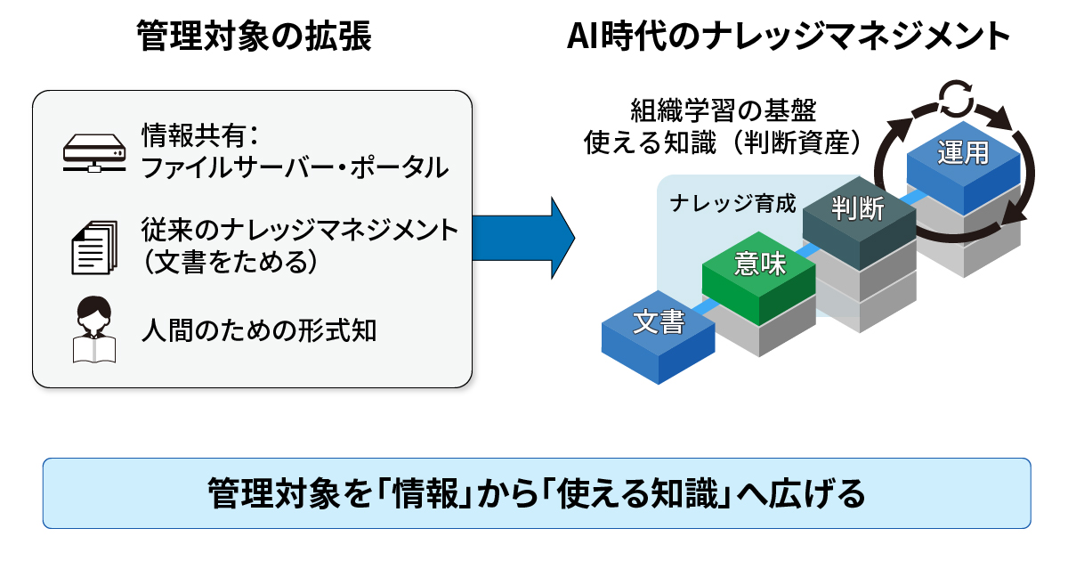 これまでのナレッジマネジメントは、知識を形式知化し「共有の仕組み(ファイルサーバーなど)」に蓄積することが目的でした。つまり、管理対象の大半は「情報(文書)」にとどまっていました。