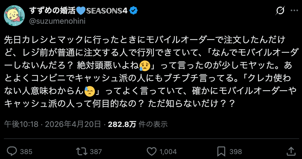 彼氏がモバイルオーダー非利用者を「頭悪い」と発言したことへのモヤモヤと、自身のキャッシュ派への疑問が一つの投稿に混在した内容で、読んだ人が「どっちの話なの?」と混乱し、批判リプが殺到した。