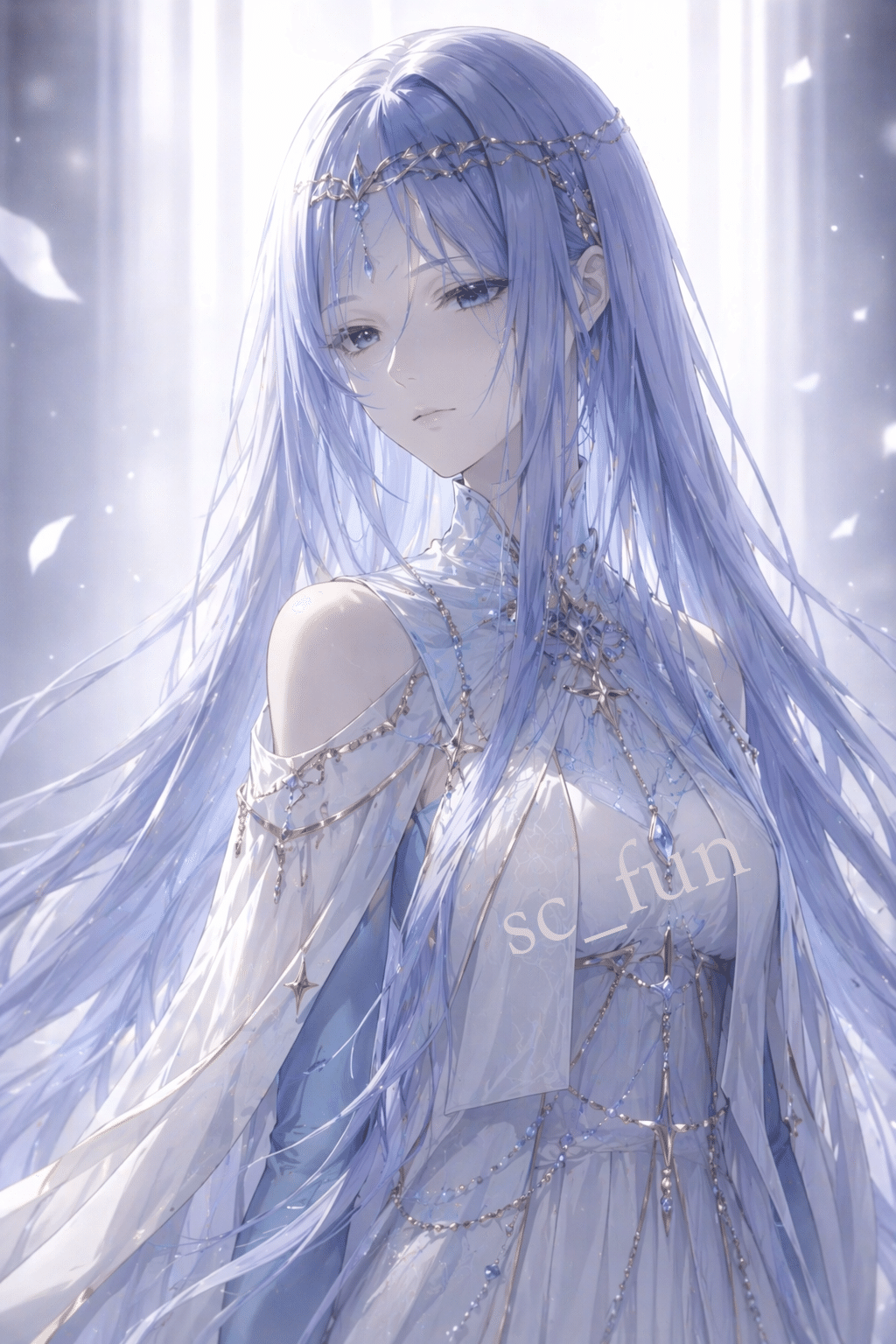 まず印象的なのは、淡い青白の長髪と、白を基調にした神聖な衣装です。