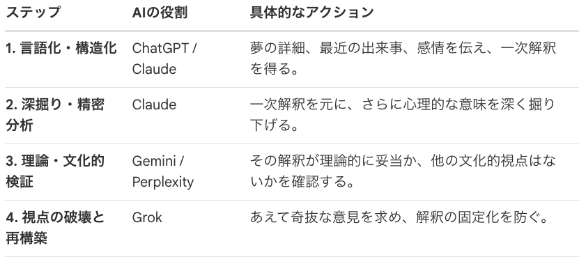 むろん、皆様がこの「各AIの特性や使い分け」を踏まえて、ご自身の夢の分析をなされることについては、やぶさかでない、というより、おおいに、やってみて欲しい。
