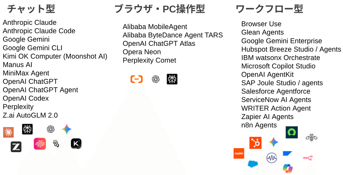 チャット型(12サービス): ChatGPT Agentのように、会話を通じてツールを使いこなすエージェント