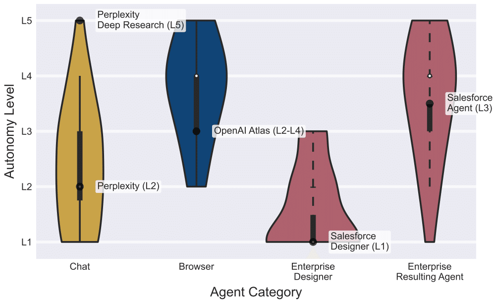 そこで研究者らは、各サービスの自律性レベルをレベル1(人間が主導)からレベル5(完全自律)までの5段階で評価しました。