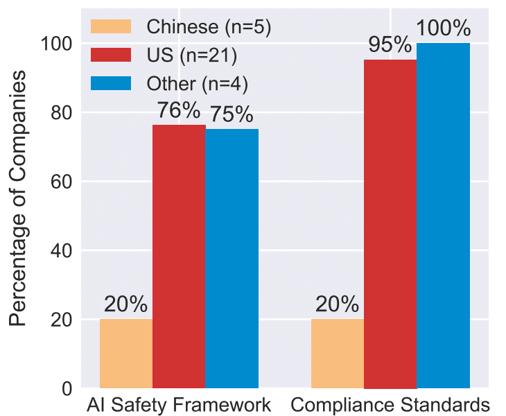 一方で、中国系企業は 図6が示す通り、安全性の枠組みや標準への準拠を公表している企業が極めて少ない(調査対象5社中1社のみ)という、統治体制の明確な違いが浮き彫りになりました。Z.aiを除く中国企業は、AIの安全性と信頼性に関するフレームワークを公表しておらず、基準への準拠についても文書化していなかったのです。