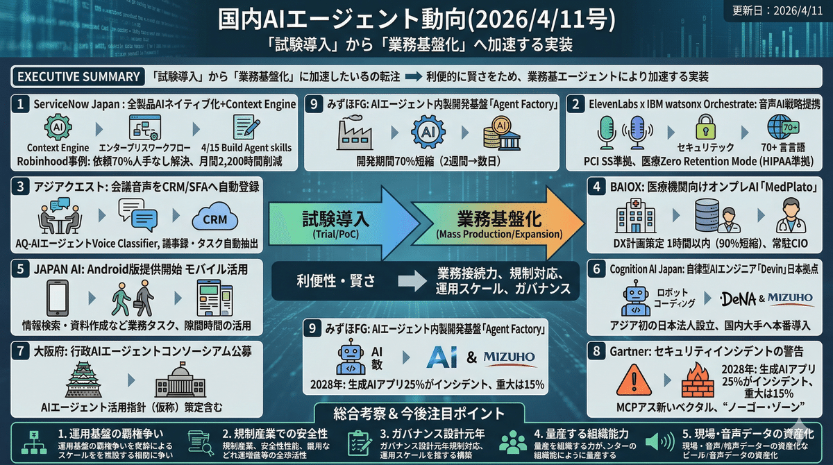 2026/4/10の国内AIエージェント動向は、「試験導入」から「業務基盤化」への移行が見えてきている。ServiceNowの全製品AIネイティブ化、みずほのAgent Factory、Cognitionの日本法人設立は、エージェントを単体活用する段階を超え、開発・運用・展開までを企業内で量産するフェーズへの進展を示す。一方で、ElevenLabs×IBMの音声AI、BAIOXの医療オンプレ、アジアクエストの会議データ業務化、大阪府の行政指針策定など、業界別実装も加速。利便性競争だけでなく、セキュリティ、ガバナンス、現場定着力を含めた総合戦が本格化している。