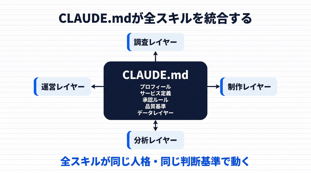 どのスキルを呼んでも、このCLAUDE.mdが最初に読み込まれます。つまり、全スキルが「同じ人格・同じ判断基準・同じ品質水準」で動きます。