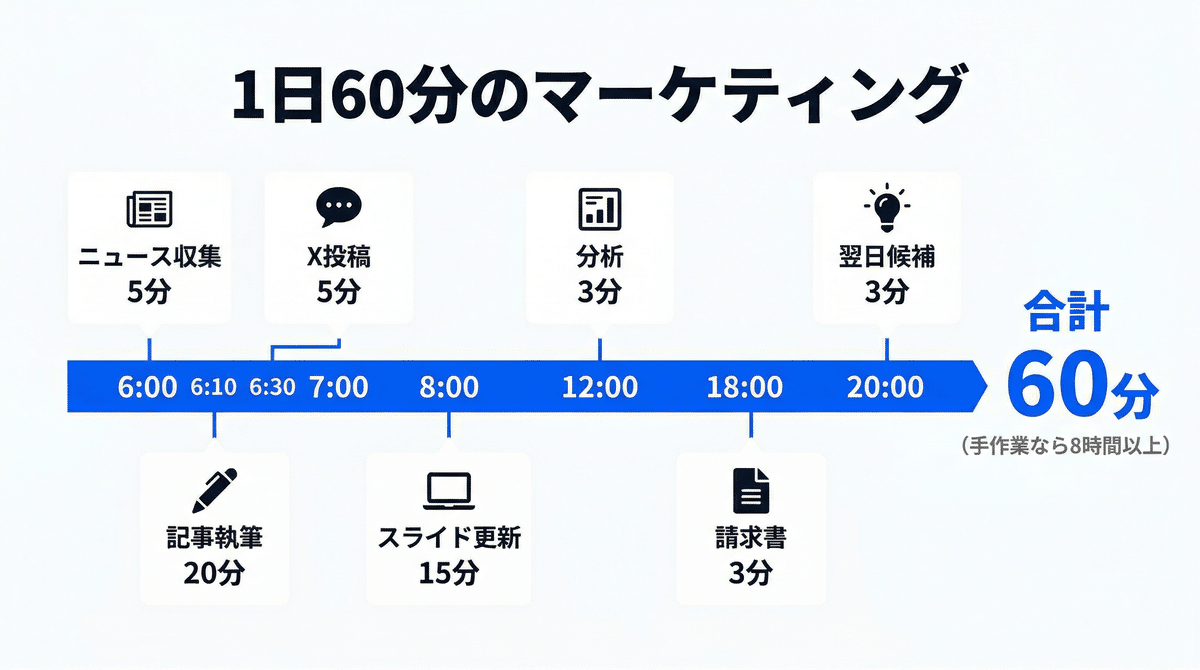 同じ内容を手作業でやれば、記事だけで3〜4時間、SNS・メール・スライド・請求書を含めると1日8時間は軽く超えます。