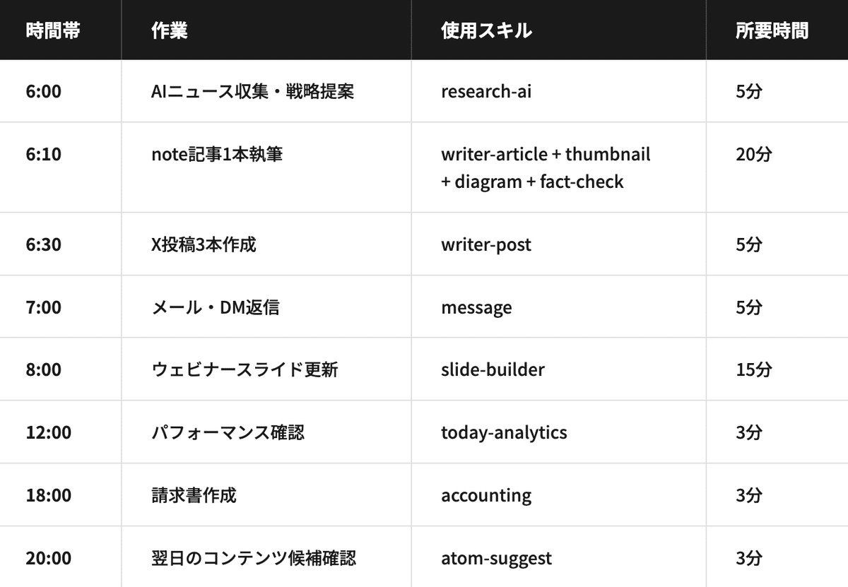 この記事では、21スキルの全体設計、統合の設計思想、1日の実働タイムライン、そして構築プロセスの全てを書きます。