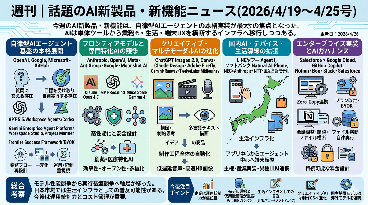 今週のAI新製品・新機能は、モデル性能競争から「誰がAIエージェントを安全に実装し、継続運用できるか」という実行基盤競争へ軸足が移った点が重要である。OpenAIやGoogleは自律実行型AIの土台を整え、MicrosoftやGitHubは開発現場でのモデル選択・統制を強化した。一方、AnthropicやOpenAIは医療、創薬、サイバー領域など専門特化AIを進め、CanvaやAdobeは制作工程全体の自動化へ踏み込んだ。国内でも生活導線、端末、産業実装、国産LLM連携が進み、AIは「試す技術」から「組織と社会の動線を再設計する技術」へ変わり始めている。
