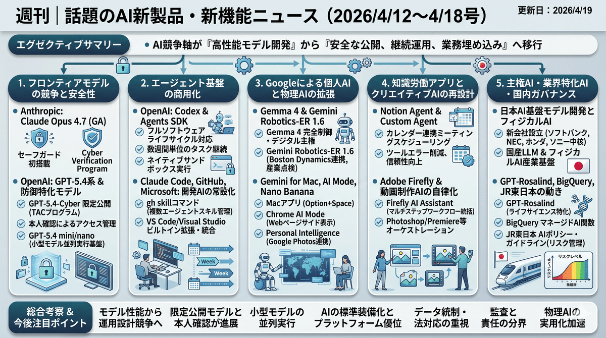 今週の話題のAI新製品・新機能ニュースは、競争軸が「高性能モデルの開発」から「安全に公開し、継続運用し、業務に埋め込む仕組み」へ移ったことを示した。AnthropicとOpenAIはサイバー領域で限定公開と本人確認を前提にした安全設計を打ち出し、OpenAIやGitHub、Microsoftはエージェントを常設的に動かす開発基盤を拡充。Googleは個人AIと物理AIを日常導線へ統合し、NotionやAdobeは知識労働と制作実務の自動化を前進させた。加えて、主権AI、業界特化AI、企業ガバナンスの整備が進み、AI導入は実験段階から実装・運用段階へ明確に入っている。