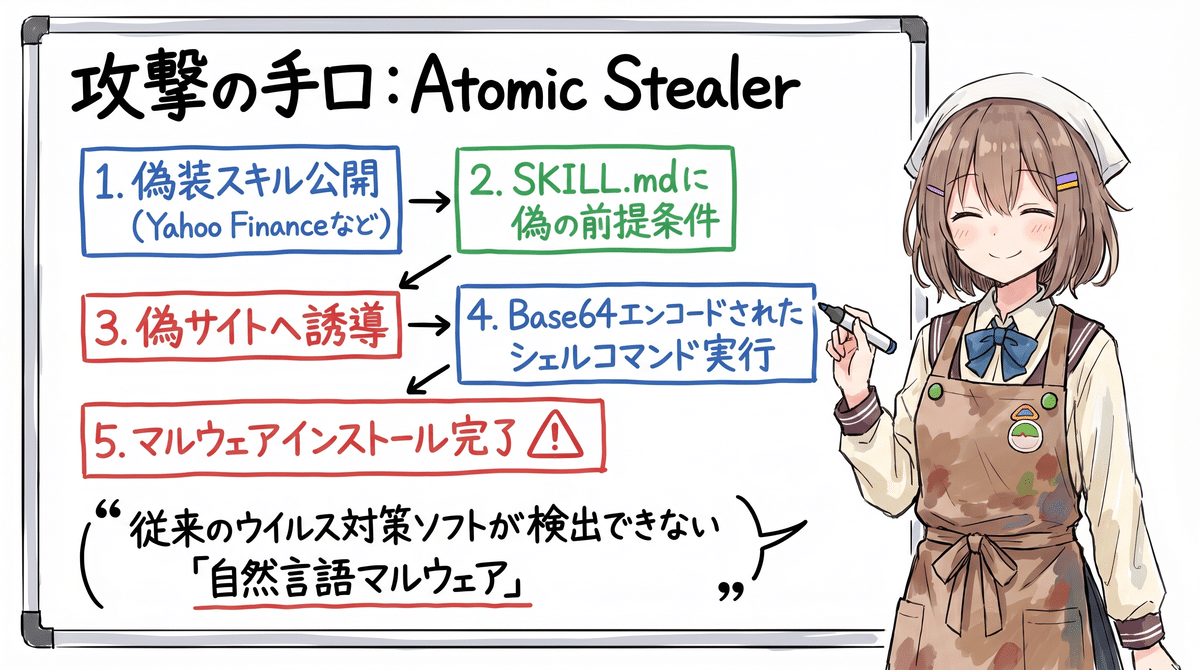 ここがゾッとするポイントで、SKILL.mdには実行可能なコードがほぼ含まれないため、従来のウイルス対策ソフトが検出できない。