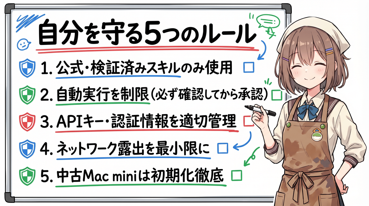 🛡️ 守るべきルール: 公式スキルのみ、自動実行制限、APIキー管理、ネット露出最小化、中古は初期化